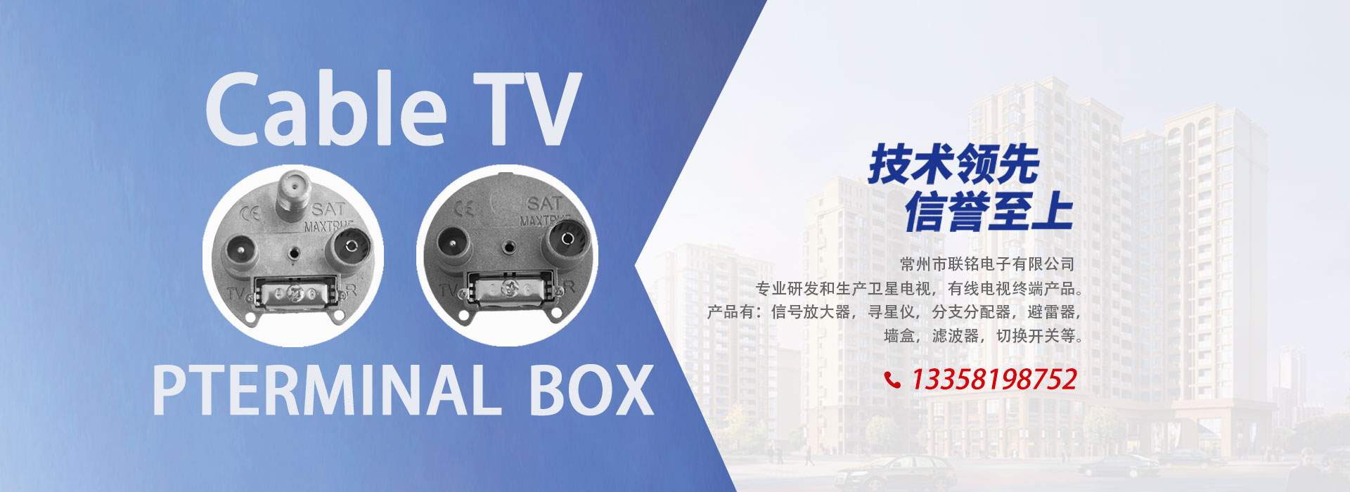 常州市联铭电子有限公司是一家专业研发和生产卫星电视,有线电视终端产品的企业。产品有:墙盒,信号放大器,寻星仪,分支分配器,双工器,滤波器,避雷器,切换开关等。 公司创立以来,秉承“您的需求就是我们努力的方向,客户满意就是我们的成功,合作共赢”为经营目标。产品远销西欧、东欧、南北美洲、东南亚、中东、非洲,香港、台湾等国家和地区。 热忱欢迎海内外客户前来洽谈业务!